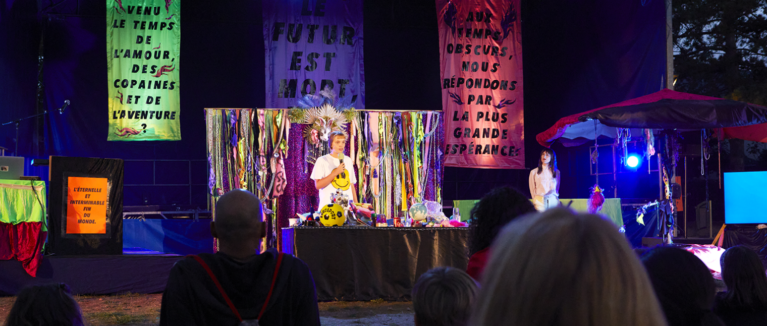 Déterminez votre profil type de relation à l’avenir : plutôt « décroissant téméraire »ou « conspirationniste romantique » ? Pénétrez les espaces du TNG-Vaise, même les plus inédits, et testez les propositions artistiques les plus décalées : incarner un fantôme, entrer dans un smartphone pour s’adonner à l’écriture prédictive de SMS, s’abreuver d’un discours de Mel Gibson, ou tout lâcher dans une joyeuse messe dansante détox post-apocalyptique. Le théâtre ne pouvait rêver fête de réouverture plus joyeuse et électrisante. En espérant que le futur le soit aussi !