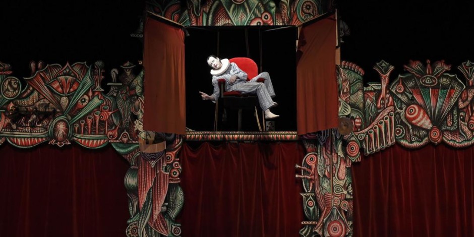 Ici la figure du tyran machiavélique et monstrueux nous apparaît sous les traits d’un étonnant clown emprisonné dans son pyjama rayé au réveil d’un cauchemar face à son propre double féminin. Les autres personnages peuplant la pièce composent un tourbillon infernal et étrange. Soit autant de fantômes et de fantoches réels ou fantasmés, habitant de leurs traits des éléments aussi divers que des ballons, des barbes à papa et autres masques devenant d’inquiétants visages et prenant vie par le biais de techniques d’animation.