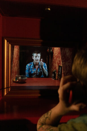 En décrochant le combiné, vous êtes mis en relation avec un·e comédien·ne virtuel·le dans une rare proximité, comme si vous étiez placé.e de l’autre côté du miroir d’une loge. Grâce à un dispositif de théâtre optique, cet·te interprète apparait virtuellement et vous regarde droit dans les yeux pour partager avec vous un monologue de théâtre.